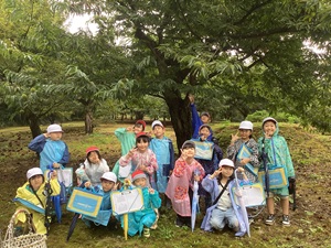 1,2年生は、生活科の地域探検で今井観光栗園を見学しました。 栗林に落ちている栗を実際に足で割り栗を拾ったり、栗のイガに触ったりしながら観察しました。 目黒さんから栗販売について沢山質問に答えていただきました。 最後に栗ご飯のおにぎりをお土産にいただきました。 また、1・2・3年生は、学校のお隣の田澤農園に伺いました。 シャインマスカットの育てるコツを教えていただき、丁寧に育てていることが分かりました。 試食させていただいたシャインマスカットがとても甘くておいしく、子どもたちは大喜びでした。