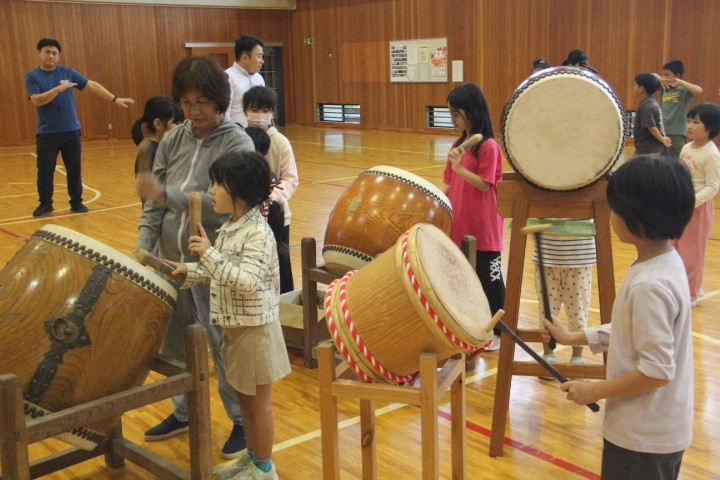 5時間目に、全校で盆踊りの練習を行いました。 地域の方2名を講師にお迎えし、盆踊りの動きと太鼓のたたき方を教えていただきました。動きやリズムが難しいのですが、子どもたちは踊り手と太鼓に分かれ、楽しく練習に取り組みました。文化祭当日は、子どもたちと保護者・地域の方々みんなで盆踊りを踊ります。