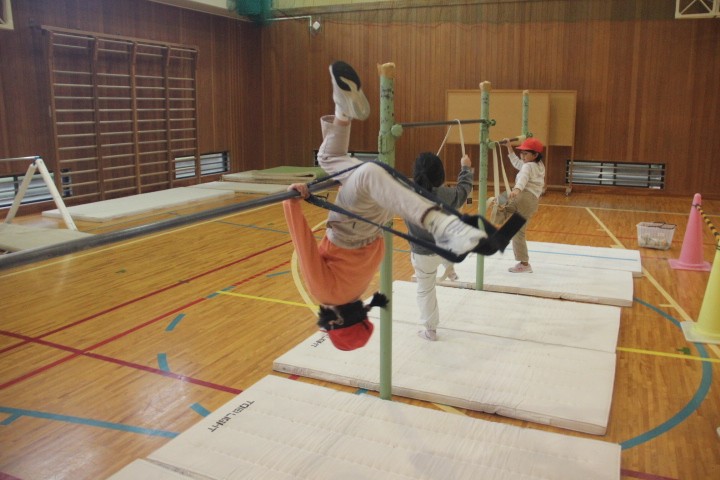 東山小学校では、全校合同体育で鉄棒あそび・鉄棒運動を行っています。 鉄棒カードの初級と上級を配り、「できる技を増やそう」というめあてのもと、みんなで取り組んでいます。休み時間も熱心に練習しています。逆上がりやこうもりふり、足かけ上がりなどの技に挑戦し、いろいろな技ができるようになりました。