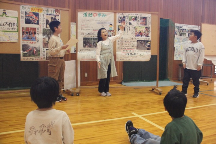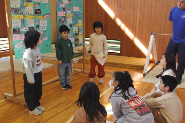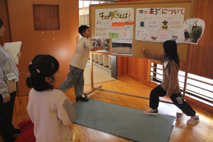 1時間目に、全校児童で「ふるさと学習」を実施しました。 11月7日(金)の全国へき地教育研究大会でポスターセッションを実施するので、本番を想定した練習を行いました。当日は、ふるさと学習で学んできたことを、参会者に向けて発表したり質問を受けたりします。今日は、子どもたち同士で発表し合い、感想やアドバイスを伝え合いました。