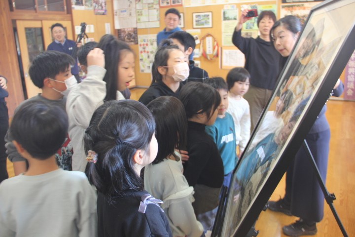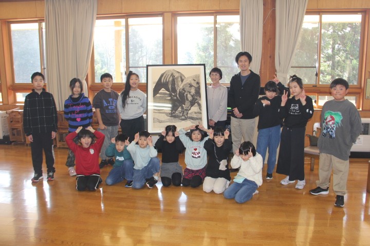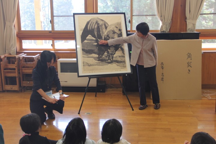 本日、東山小に寄贈いただいた版画の贈呈式を行いました。 阿賀野市在住の髙澤吉清さんの遺作となった版画作品を、ぜひ東山小学校に寄贈したいというご家族のご厚意で来校いただきました。贈呈式では、奥様の芳子さんから全校の子どもたちへお話をしていただきました。東山の牛の角突きを観たときの感動をもとに制作した版画ということで、子どもたちは力強い牛の表現についてそれぞれ感想を述べていました。作品は図工室に飾ります。