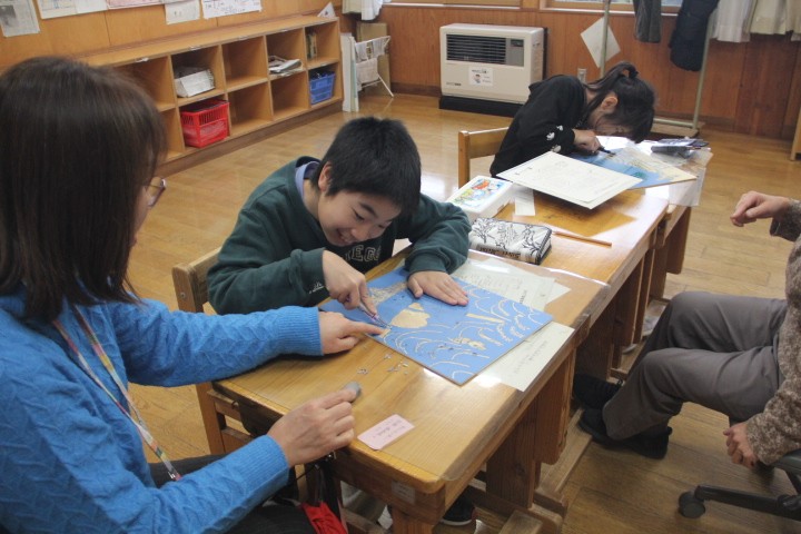 本日の授業の様子から・・・ 1・2年生は、国語「読書の時間」です。冬休みに読む本を一人3冊借りました。子どもたちは、思い思いの本を借りていました。 3・4年生は、図工「切って、かき出し、くっつけて」です。紙で人物や背景を制作し、ロールでインクを付けて刷りました。 5・6年生は、図工「木版画」です。線を太く残しながら、丁寧に彫り進めています。集中して彫刻刀を正しく安全に使っています。