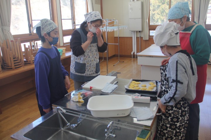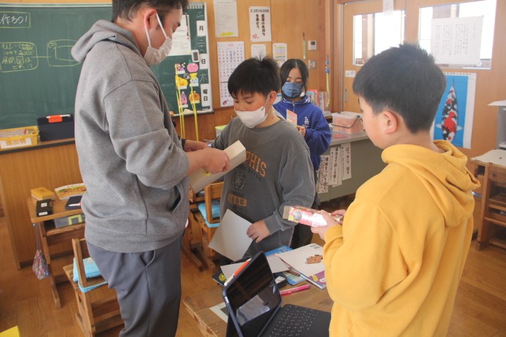 本日の授業の様子から・・・ 1・2年生は、国語「学校の行事を紹介しよう」「宝物を紹介しよう」です。一人一人がテーマに沿った内容を発表し、お互いに感想を言ったり質問をしたりしながらやりとりを楽しみました。 4年生は、算数「直方体と立方体」です。実際に箱を切り開いて、展開図の問題を作りました。活動を通して展開図の理解を深めました。 5・6年生は、家庭科です。明日の「6年生に感謝する会」で、みんなで食べるクッキーを作りました。楽しみながら上手に作ることができました。
