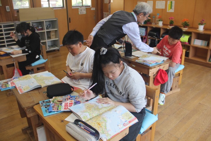 各学級の授業の様子から・・・ 1・2年生は、図工「ちょきちょきかざり」です。折り紙を折ったり切ったりして、いろいろな楽しいすてきな飾りを作りました。 3・4年生は、算数「九九のひみつをさがそう」です。子どもたちは、九九を唱えながら同じ数ずつ増えたり減ったりすることに気付いていました。 5・6年生は、社会です。世界の国々と、その中の日本の位置について学びました。子どもたちは、地図を見ながらたくさんの地名を覚えました。