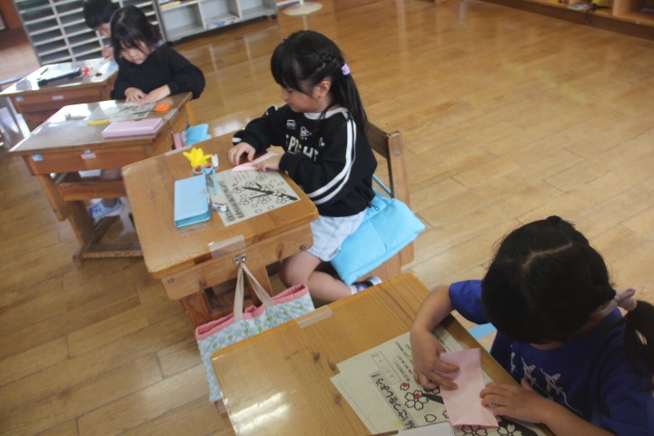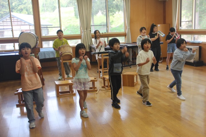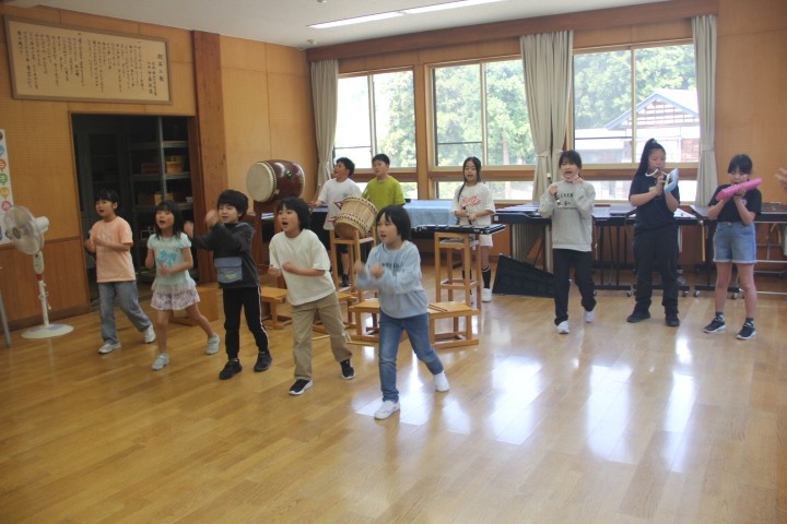 各学級の授業の様子から・・・ 1・2年生は、図工「ちょきちょきかざり」です。折り紙を折ってハサミで切り、花飾りを作りました。みんなのすてきな作品は教室に飾ります。 3~6年生は、「闘牛の歌」の練習です。一人一人が担当している楽器や歌の確認をしました。久しぶりでしたが、みんなで合わせることができました。今年度も「牛の角突き」をはじめ、様々な場面で「闘牛の歌」を披露します。