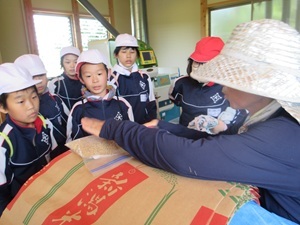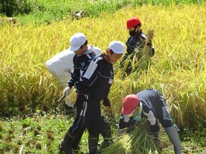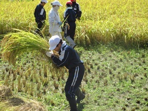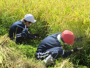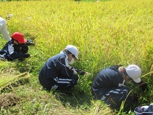 5年生は、総合的な学習の時間で取り組んでいたお米作りで稲刈り体験をしました。 垂れた稲穂をかき分け、鎌で刈り取りました。 最初は、鎌の扱い方に戸惑っていましたが、すぐに慣れて上手に刈り取りするこ...