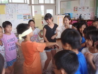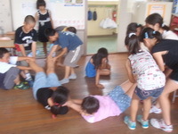 みんなで学習や給食の準備を協力したので,1学期の最後にがんばったパーティーを開きました。目隠しゲームや大根抜き,ドッジボールやハンドベースボールなど,体を動かし大いに楽しみました。