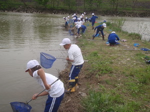 4年生の総合の学習は,地域にある五辺の水辺を調査しています。雪が消え,新緑のまぶしい季節になりました。子どもたちは,アオサギの卵やエビ,小さな魚など,いろいろな生き物を発見し,興奮していました。