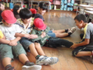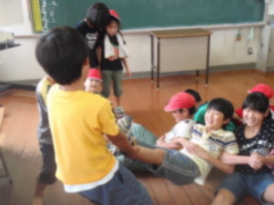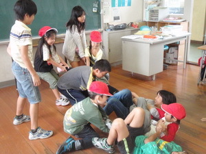 今月は,「深めよう絆 強調月間」ということで,今回は,1年生と4年生で一緒に遊びました。大根抜きで,1年生が抜けそうになるのを,4年生が必死につかむなど,協力して楽しく遊ぶことができました。