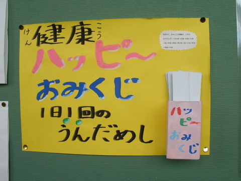 保健室の掲示板に【健康ハッピーおみくじ】を作りました。「オレ大吉だった!」「すげえーミラクルデイー(一番良い)だ!!」「今日は、階段静かに降りようっと・・」休み時間、通りかかっておみくじを引く...