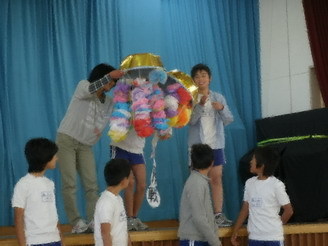 児童朝会で、すくすく委員会の子どもたちが、「省テレビ省ゲーム大作戦がんばろう!」と呼びかけて、くす玉を割りました。委員会の時間や休み時間を使って、今までの材料を上手に使って、一生懸命作りました...