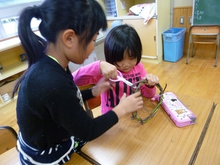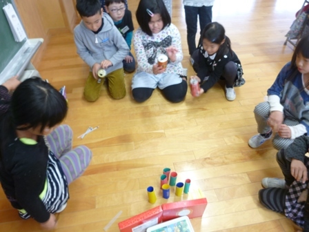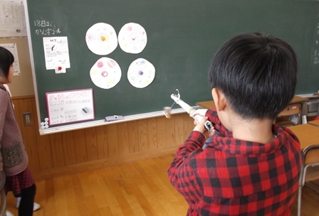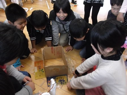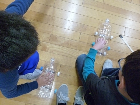 生活科の時間に、おもちゃ作りをしました。空き缶アーチェリー、ペットボトルレーシングカー、牛乳パックのびっくりカエルなど、輪ゴムを使ってびゅんびゅんとんでいくので、みんなで競争しながら楽しく遊べました。