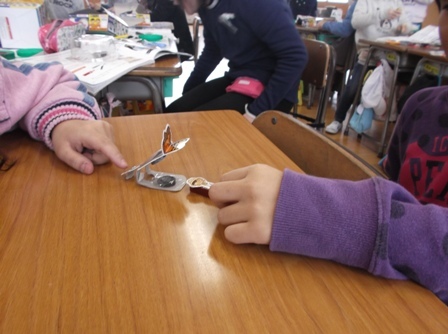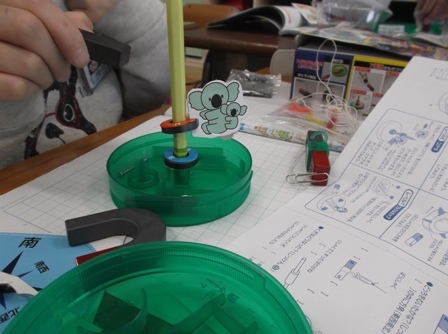 理科の学習で、磁石のひみつについて学習しました。磁石にはN極とS極があり、引きつけ合ったり退け合ったりすることなど磁石の特性について学びました。最後に、その特性を使ったおもちゃ作りをして楽しみました。