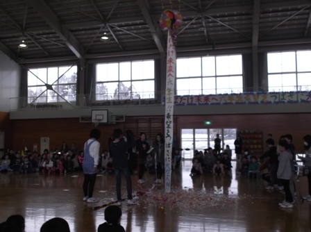 3月2日の六送会。4年生は、くす玉作りを担当しました。早く課題を終えた時や休み時間にも、みんなで協力して取り組みました。 当日は、初めはうまく割れなかったものの、6年生に工夫して割ってもらって、...