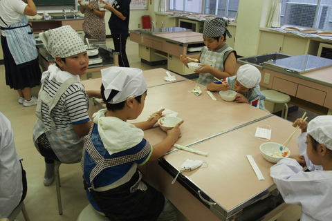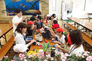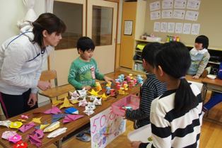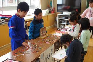 今日は1年生をお客さんに呼んで、お店屋さんを開きました。紙コップで作った人形やビーズの飾り、折り紙、プラ板のアクセサリーなど、いろいろな商品を用意し売りました。「いらっしゃいませ。」「100円...