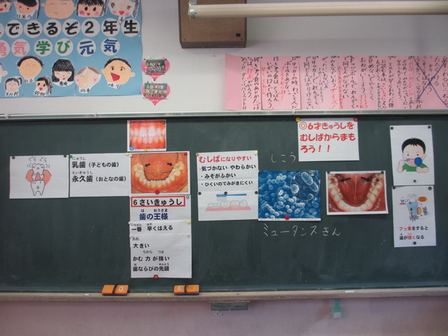 11月に、歯科保健指導を行いました。1,2年生は一番むし歯になりやすい「第1大臼歯(6才臼歯)のみがき方」、3年生は「よく噛んで食べよう」4年生は「おやつは質と時間を考えて食べよう」5・6年生は、思春期に増える「歯肉炎を予防しよう」を学習しました。歯ブラシを歯と歯肉の間にまっすぐに当て、20回軽く小刻みにみがいたところ「つるつるになった!」と子どもたちから声があがりました。おやつ・歯みがき・定期検診などに注意して、一生使う大切な歯をずっと守っていってほしいと願っています。