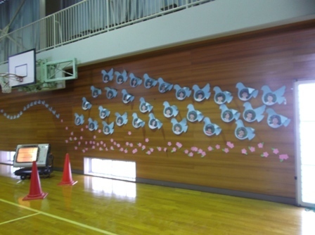 今日3月2日は、六送会。3年生は、この日のために六年生一人ひとりの顔写真を使って体育館の壁面を飾りました。スローガン「はばたけ未来へ六年生 希望をつばさに大空へ」に合わせたすてきな飾りが六送会を盛り上げました。