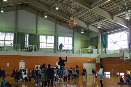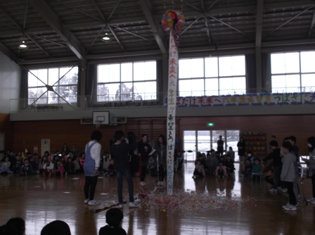 3月2日の六送会。4年生は、くす玉作りを担当しました。早く課題を終えた時や休み時間にも、みんなで協力して取り組みました。 当日は、初めはうまく割れなかったものの、6年生に工夫して割ってもらって、素敵なメッセージや飾りで六送会を盛り上げました。