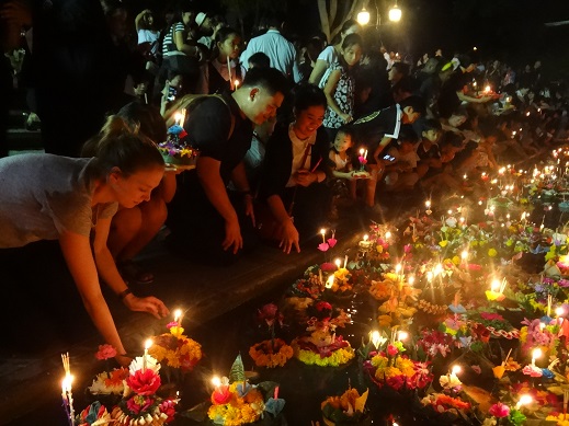 11月14日はロイクラトン(灯篭流し)のお祭りの日でした。水や川の精霊に感謝を捧げ、また罪や汚れを水に流して魂を清めるためのものだそうです。バナナの茎や葉などで作った灯篭を花やろうそくで飾り付け、満月を映す水面に流します。 私は自分で作った灯篭を持って、近くの公園の池に行ってきました。たくさんの人が色とりどりの灯篭を池に流していて、暗闇の中に輝く光がとても美しかったです。ちょうどスーパームーンの日とも重なり、何とも神秘的な光景でした。