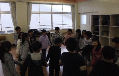 音楽の授業で「なべなべそこぬけ」という歌遊びをしています。2人組で音楽に合わせて背中あわせになったり向かい合ったりします。2人組ができると、次は4人組、最後は全員で!子どもたちは楽しそうに取り組んでいます。